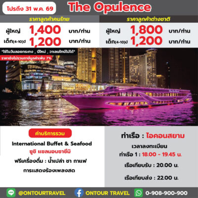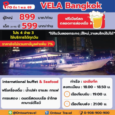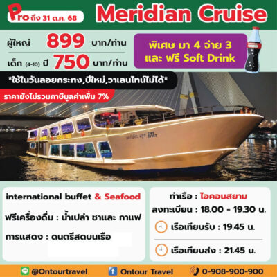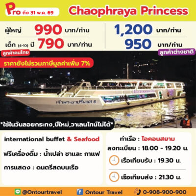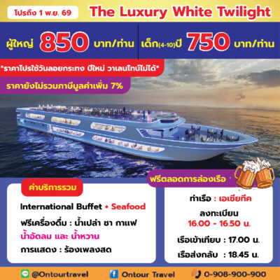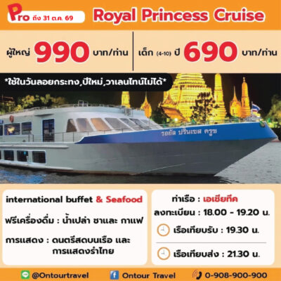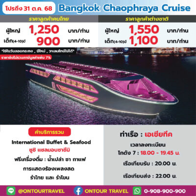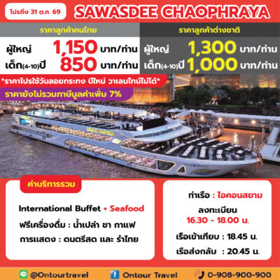ล่องเรือเจ้าพระยา ทานอาหารบุฟเฟ่ต์ไทย-นานาชาติ และซีฟู๊ด บนเรือสำราญลำใหญ่ ที่มีขนาดความจุตั้งแต่ 150-700 ท่าน เพลิดเพลินไปกับการชมสถานที่ท่องเที่ยวยอดนิยมและวัดวาอารามยามค่ำคืนด้วยการล่องเรือเจ้าพระยา ที่ประดับไฟแสงสีอย่างงดงาม พร้อมทั้งสนุกสนานกับการแสดงต่าง ๆ บนเรือสำราญ ในราคาประหยัด คุ้มค่ามากๆ