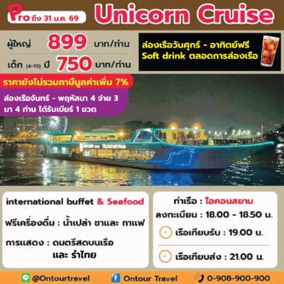 ล่องเรือเจ้าพระยา ทานอาหารบุฟเฟ่ต์ไทย-นานาชาติ และซีฟู๊ด บนเรือสำราญลำใหญ่ ที่มีขนาดความจุตั้งแต่ 150-700 ท่าน เพลิดเพลินไปกับการชมสถานที่ท่องเที่ยวยอดนิยมและวัดวาอารามยามค่ำคืนด้วยการล่องเรือเจ้าพระยา ที่ประดับไฟแสงสีอย่างงดงาม พร้อมทั้งสนุกสนานกับการแสดงต่าง ๆ บนเรือสำราญ ในราคาประหยัด คุ้มค่ามากๆ