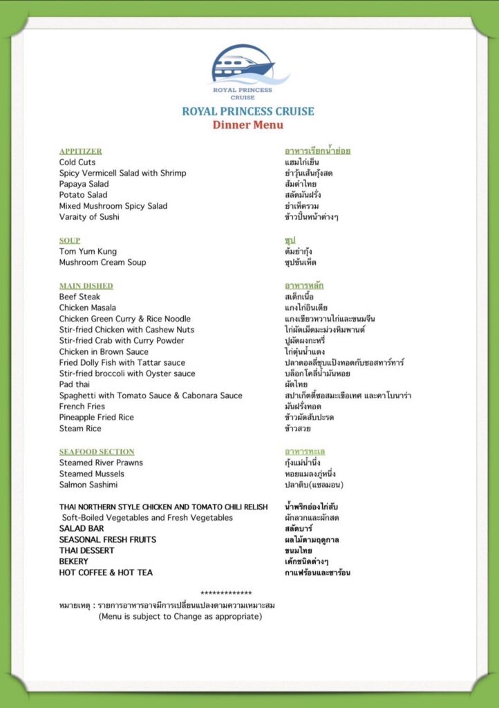 ดื่มด่ำไปกับบรรยากาศแห่งความหรูหรางดงามของ Royal princess cruise ตระการตากับแสงสียามค่ำคืนในท้องน้ำเจ้าพระยา อิิ่มไม่อั้นกับอาหารนานาชาติ ที่ตั้งใจรังสรรค์ด้วยเชฟระดับมืออาชีพ หลากหลายเมนู ชมการแสดงศิลปวัฒนธรรมไทยอันน่าภาคภูมิใจและรับฟังบทเพลงไพเราะ อีกทั้งบริการคุณภาพระดับโรงแรมห้าดาวให้ค่ำคืนที่แสนโรแมนติคของคุณ เต็มเปี่ยมไปด้วยความสุขกับคนพิเศษข้างกาย
